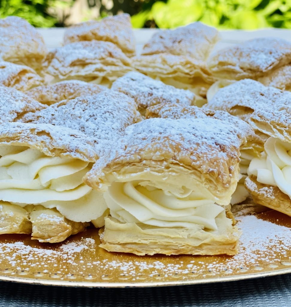Place on a tray the baked puff pastry. Spread evenly the whipping cream on half of the puff pastry, place the second half on top of each pastry.