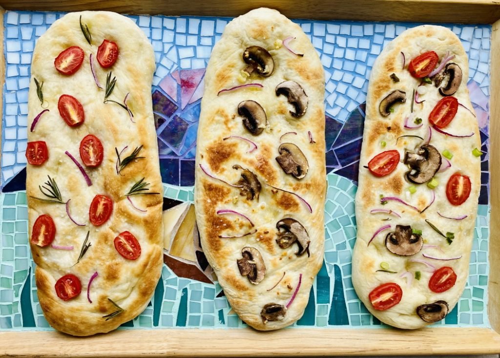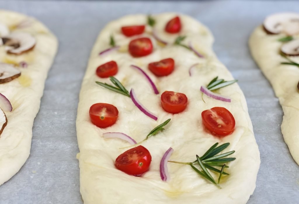 Let the balls dough rise for 30 minutes. Gently stretch the balls along to make focaccia shape. spread with olive oil, kosher salt, add thyme, rosemary and other vegetables you love.