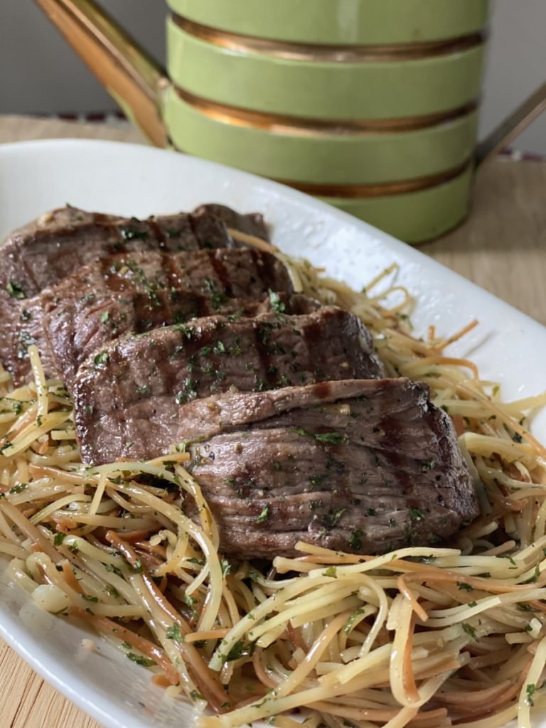 Slice and Season the flank steak with salt and pepper and crushed garlic.