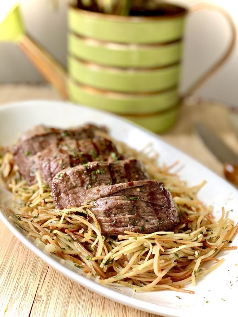 Increase heat to high. Add the sliced steak to the pan and cook for 1 or 2 minutes each side or until lightly browned.